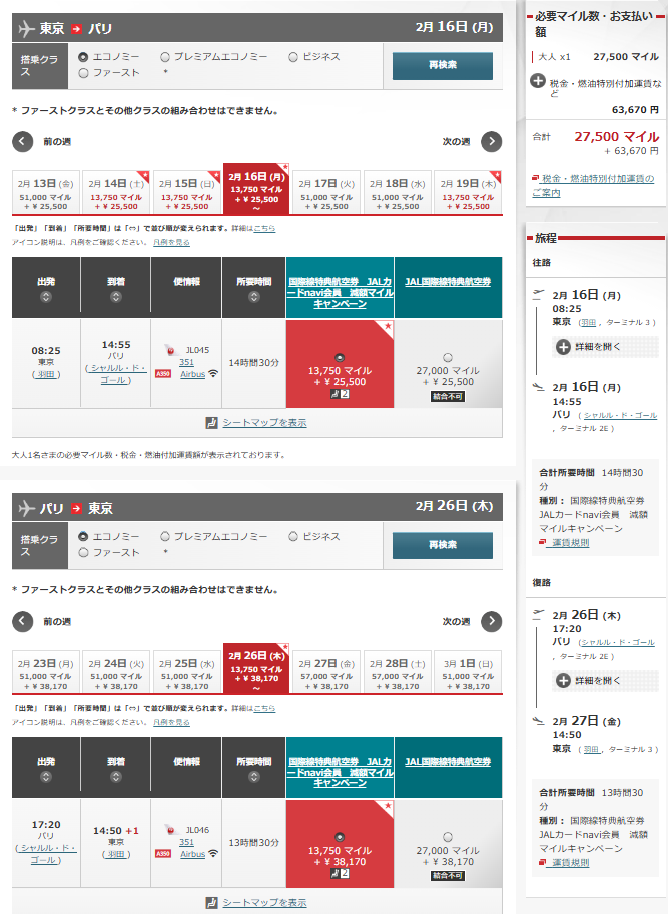 これが実際の予約画面です。通常のJMB会員だと右側の「JAL国際線特典航空券」しか表示されませんがJALカードnavi会員だと、「国際線特典航空券 JALカードnavi会員 減額マイルキャンペーン」という枠が表示されます。パリ便では通常の27000マイル→13750マイルと、ちょうど半分のマイル数になっていることがおわかりいただけると思います。