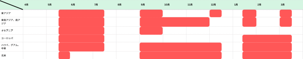 下の図に、2025年4月~2026年3月までの地域ごとの対象期間をまとめました。赤くなっているところが対象期間です。往復ともこの期間に含まれていないと減額マイルが適用されません。